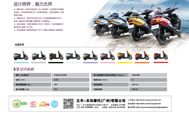 凈原V1----五羊-本田首款高端新能源摩托車,其以五羊-本田最暢銷的踏板摩托車為原型自主研發的電力驅動兩輪踏板車。凈原V1完全按照五羊-本田一貫的高品質標準設計、制造,其不但符合國家電摩標準、更在很多領域優于國家電摩標準;質量和性能遠遠超越市場現有超標電動自行車。凈原V1在傳承五羊-本田高端摩托車典范的產品基因的同時,更可共享五羊-本田遍布全國的優質高效服務渠道,讓用戶擁有遠遠超越“電動自行車”的駕乘感受與服務享受。