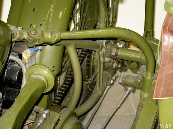 “97陸王”的前制動拉伸開關采用拉線式傳遞結構。前轉向握把與制動拉伸開關設立了較大的開合空間,以便嚴寒地區日軍駕駛員佩戴厚重的棉手套駕駛并進行制動控制。“97陸王”制動開關布置在左側握把,控制全車3條車輪。旋轉右側握把為油門開關。