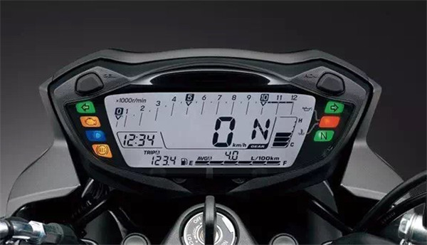 全液晶儀表盤:SV650A采用全液晶儀表盤,儀表盤上包括時速、轉速、總里程、區域里程、文件位、水溫、平均油耗、實時油耗、預估可行駛里程、油量、時間等信息。儀表采用白色背光,并搭配少見的前次最高轉速顯示功能。