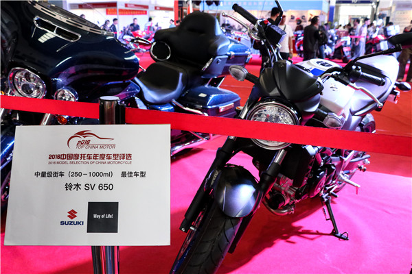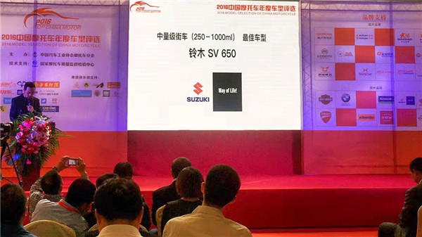 第一屆中國年度進口摩托車十佳車型評選由中國汽車工業協會摩托車分會領導,媒體摩托聯盟及進口摩托聯盟協辦。本次評選是通過網絡投票統計,由網友直接點選參評車型,媒體通過關注度、動力、操控、外觀、安全科技這5個維度進行評選,最終網友+媒體進行票選統計。本次參評的車型共計155款,分成十個類別并在其不同類別中選取一輛最佳車型。SUZUKI 鈴木SV 650在此次評選中斬獲了最佳中量級街車(250-1000ml)頭銜!