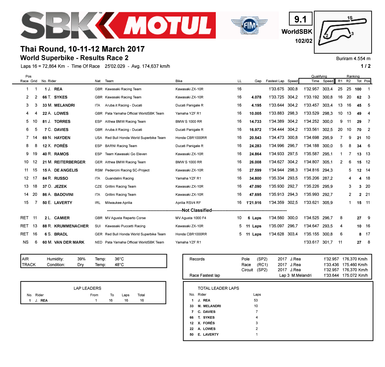 乘著澳大利亞揭幕戰的氣勢(兩節賽事都奪得了冠軍),應屆的世界冠軍 Rea 在第二站泰國依然展現出強勢。