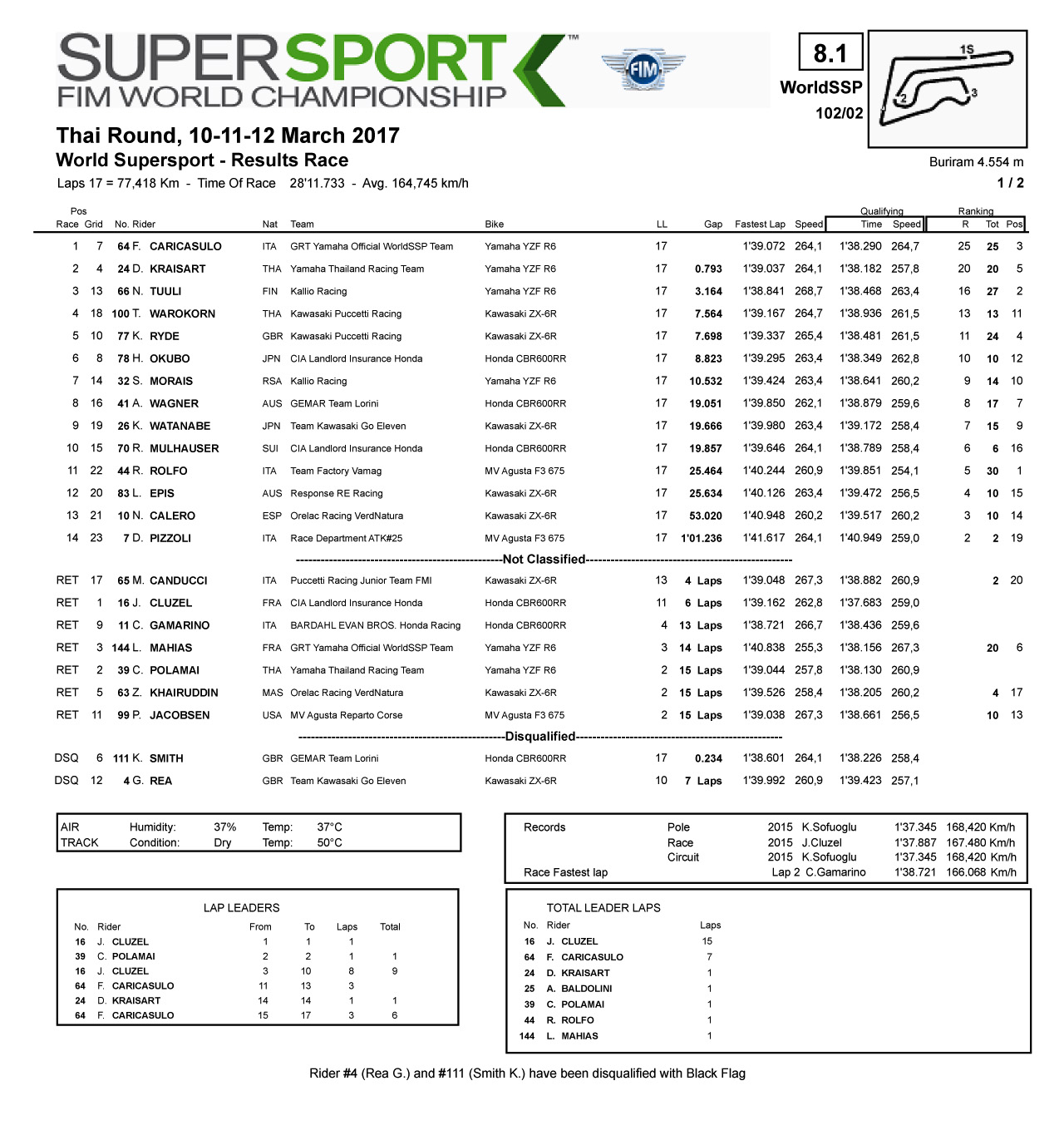 Yamaha 在這一站 WSS 600(WorldSSP 600)級別的比賽可謂光芒四射,最終駕駛 64 號賽車的 Yamaha GRT 工廠車隊車手 F. CARICASULO 奪得了冠軍,持外卡參賽、駕駛 4 號賽車的泰國 Yamaha 工廠車隊的本地車手 D. KRAISART 獲得了第二,另一支 Yamaha 車隊的車手、駕駛 66 號賽車的 N. TUULI 奪得了第三。