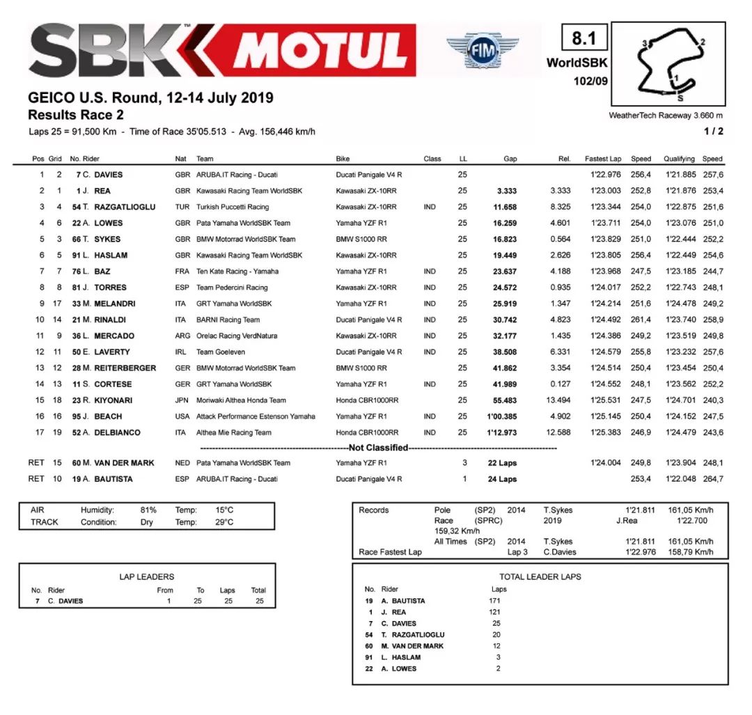 以閃電般起步的戴維斯、在比賽初段就取得了領先。盡管跑道上、此時此刻到處都是撕殺,但在第三圈就跑出了全場最快(本場比賽)圈速 1 分 22.976 秒的戴維斯,設定了自己的步伐之后、比賽中就未再受到挑戰,最后順利奪得了第二節比賽的冠軍。這是他自去年的西班牙阿拉貢站(2018 年四月 15 日)之后,時隔了一年多之后的勝利,一掃今年季初以來的低沉、并有力地回擊了此前外界對他的批評。