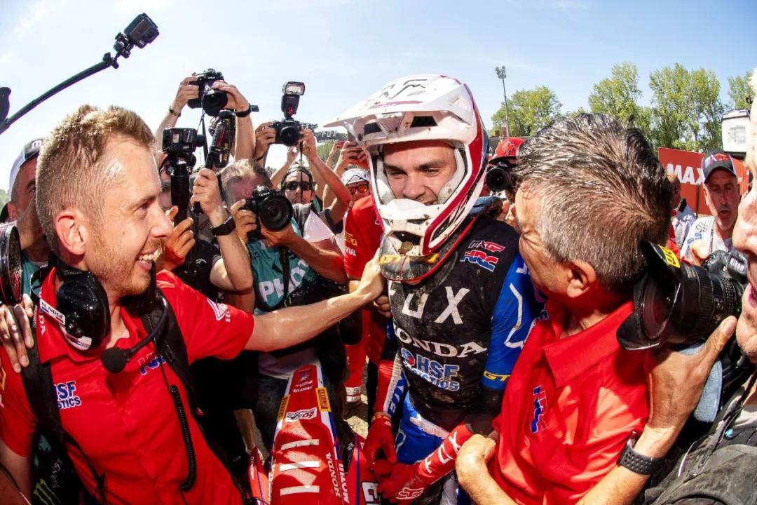 賽后、蓋沙表示,“ 贏得第三次世界錦標賽的冠軍真是一種奇妙的感覺。在經歷了兩年艱難的比賽之后,以及在今年早些時候戰勝困難的一輪(第五站的意大利 Mantova),能夠成為冠軍真的是非常、非常偉大。我非常感謝 HRC,無論是在比賽中還是在日本,他們在這段時間里,無論好壞都支持我,這是我在雨篷下的一個真正的家庭,我真的很感激能和他們一起合作得這么久。我們今年都非常努力地改進自己和 CRF450RW 賽車,讓它工作得非常出色。我們今年的開局很好,沒有任何問題,每次踏上賽道,無論情況如何,我都覺得很舒服。我想努力地去說更多(感謝大家的言語),但這真的是一次難以置信的經歷,我很高興斯洛文尼亞的很多粉絲也能出來見證這一時刻。感謝所有和我一起踏上這段旅程的人,粉絲、車隊成員,所有的人,這對我來說意義重大。”