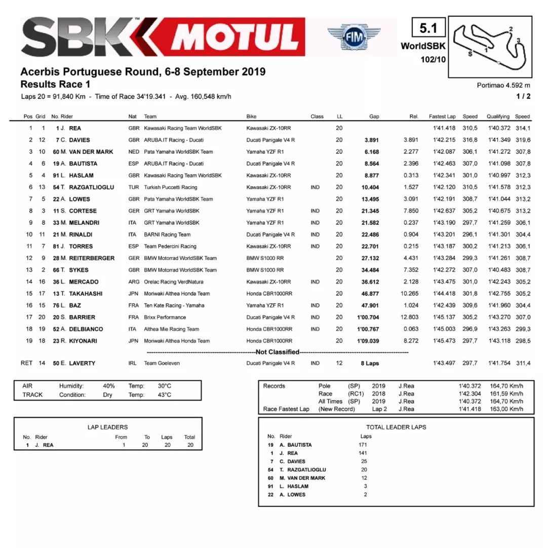 FIM 2019' WSBK 世界超級摩托車錦標賽第十站,在經過了超過一個半月的暑假(第九站的比賽,是七月 12 - 14 日舉行的美國站)后,本周(九月 6 - 8 日)在葡萄牙的 Portimao 波蒂芒賽車場舉行。