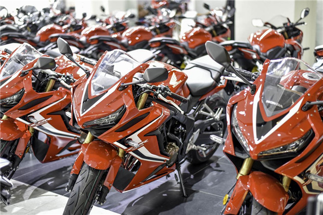 去年年末在Honda國(guó)內(nèi)公布上市的新一代中量級(jí)跑車CBR650R和復(fù)古街車CB650R可以說是很多車友都期盼已久的車型了,甚至在新車發(fā)布之前就已引發(fā)了大家的訂購(gòu)熱潮,訂單從年初排到年中,除了去年年底國(guó)內(nèi)有少數(shù)幸運(yùn)兒提到現(xiàn)車外,大部分訂購(gòu)的車友還在翹首以盼。但是今天在這家位于杭州濱江世茂智慧之門的Honda DreamWing杭州6s店內(nèi),我們卻看到了整整百臺(tái)!
