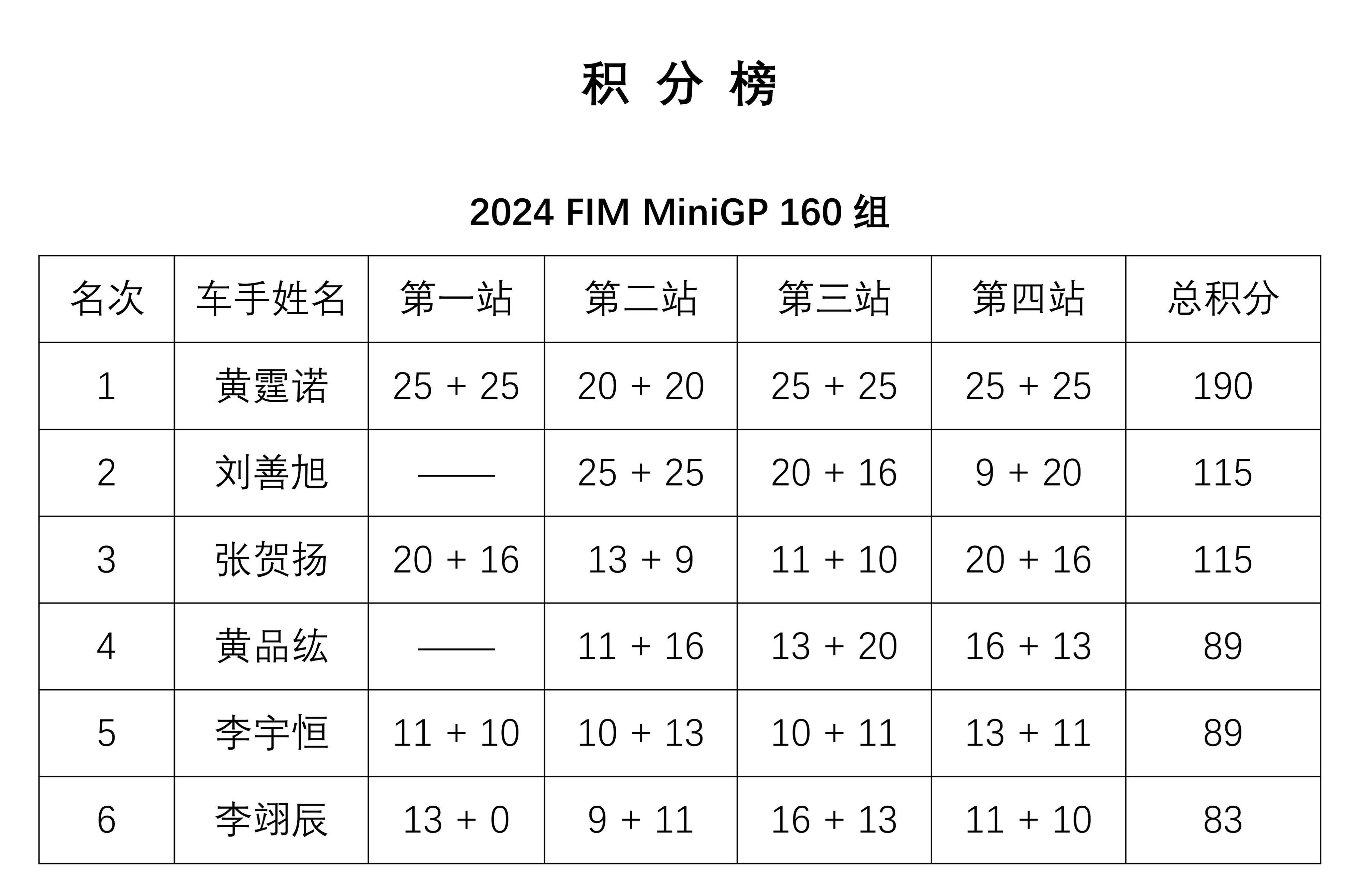 積分榜方面,兩個有著穩定參賽者的組別(Ohvale GP-0 110 賽道體驗組和 FIM MiniGP 160 組),110 賽道體驗組,莊茗皓暫時領先,但比第二名的林景源、領先優勢只有 11 分;而 160 組、黃霆諾的領先優勢達到了 75 分,提前奪得了這一組別的年度總冠軍、鎖定進軍西班牙 2024 年度總決賽的資格。第四站比賽結束之后的積分榜如下:
