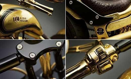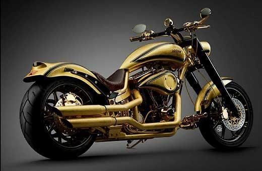據英國媒體日前報道,據了解,該款摩托車由丹麥著名的摩托制造公司Lauge Jensen打造。特別是整車24K鍍金的設計,令人大開眼界。該款摩托車由一輛時速可達250Km/h的哈雷摩托改裝而成。另外,268顆鉆石的鑲嵌也令該摩托車身價倍增。另外,先前世界最貴的摩托車為道奇戰斧V10超級摩托車,其價格達到60萬美元(約合人民幣365.5萬元)。